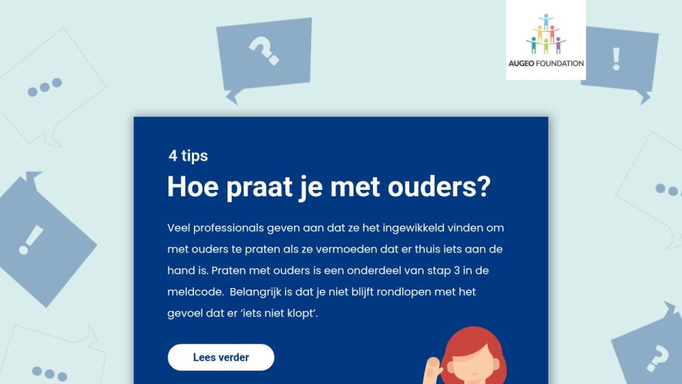 Veel professionals geven aan dat ze het ingewikkeld vinden om met ouders te praten als ze vermoeden dat er thuis iets aan de hand is. Praten met ouders is een onderdeel van stap 3 in de meldcode. Belangrijk is dat je niet blijft rondlopen met het gevoel dat er ‘iets niet klopt’.