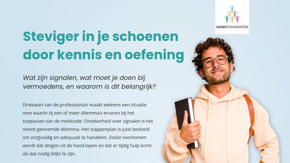 Augeo Foundation ondersteunt professionals met online cursussen over werken met de meldcode en met materialen, informatie, gesprekshandreikingen, apps om te voorkomen dat de kennis en vaardigheden wegzakken. Daarnaast bieden materialen voor extra verdieping over thema’s als: langetermijngevolgen van ingrijpende ervaringen, trauma en veerkracht.